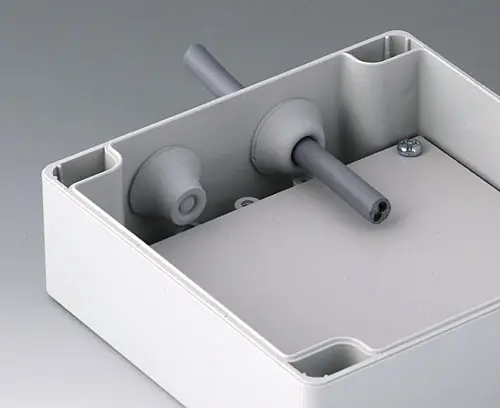 Boitier en matière plastique à deux éléments, avec joint injecté dans la partie supérieure. Zone en creux pour la protection du clavier à membrane et de membranes/feuilles design. Bossages de fixation pour barrettes DIN, circuits imprimés et plaques de montage. Dispositif rationnel de fermeture rapide en acier inox hors de la zone d‘étanchéité.