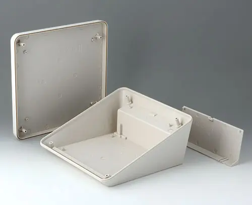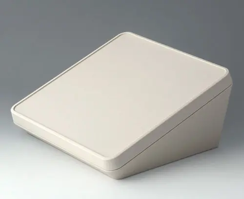Boitier en matière plastique à trois éléments, au design moderne et avec une inclinaison ergonomique de la surface de visualisation et de commande. Le couvercle compris dans la fourniture permet de fermer visuellement la zone interfaces et/ou d’installer d’autres composants électroniques dans un espace à part. Bossages de fixation pour les circuits imprimés et composants dans les parties supérieure et inférieure. Support mural et joint (pour accroître le degré de protection jusqu’à IP 65) dans la gamme des accessoires. Visseries avec vis inox et entrainement Torx dissimulées. Également utilisable en extérieur grâce au matériel haut de gamme et la construction robuste.