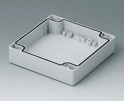 Coquille de boitier avec filet et tours à fixation comme partie séparée. À utiliser comme partie supèrieure et inférieure au choix. Vissage hors la zone étanche. Partie en creux d'environ 0,8 mm pour l'utilisation des claviers à membrane souple. Pour chaque 1 boitier vous avez besoin d'une partie avec et d'une partie sans joint.