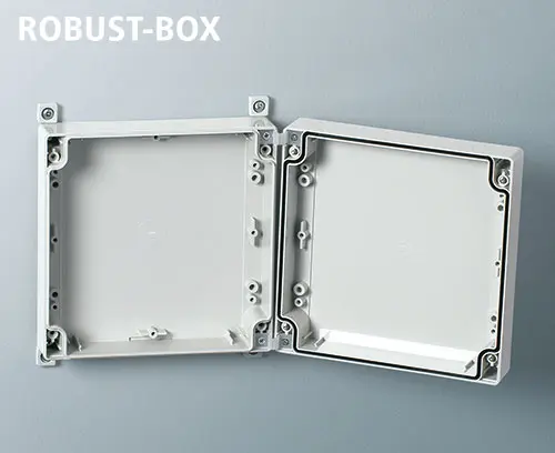 ROBUST-BOX 120 LARGE, Vers. II Boitier en plastique robuste, prédestiné aux applications électriques et électroniqus. Coquilles du boitier utilisable comme partie supérieure ou inférieure au choix. Dans chaque partie du boitier il se trouvent des filetages et bossages de fixation. Vissage hors la zone étanche. Creux d'environ 0,8 mm min. pour l'utilisation des claviers.