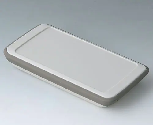 Boitier manuel en trois parties avec bague intermédiaire en TPE, de conception compacte avec une grande surface de commande allant jusqu'à 4 “ (10 cm). Toucher agréable grâce à des contours arrondis sur les côtés et une bague intermédiaire en TPE qui sert en outre de protection contre les chocs et de joint d’étanchéité pour le degré de protection IP 54. Zone de commande en creux pour l'utilisation d'une vitre frontale transparente fidèle aux contours (avec pellicule adhésive en accessoire) ou pour la protection d'un clavier à membrane personnalisé. Bossages à vis pour circuits imprimés dans la partie supérieure et inférieure.