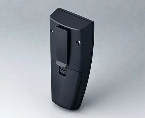 SMART-CASE M, Vers. I Boitier ergonomique en deux parties avec zone d´encliquetage en face avant et fixation par vis au centre. Possibilité de fixation pour circuits imprimés dans les parties supérieures et inférieures. Support intégré pour 2 piles rondes R03 1,5 V.