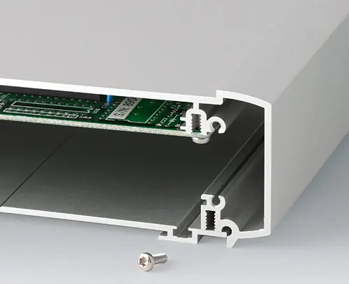 Guides horizontaux pour circuits imprimés et canaux de vissage à l’intérieur du boitier. Surfaces planes pour une intégration aisées d’interfaces. Zone de commande en creux pour la protection d’afficheurs, de claviers à membrane et d’éléments de commande.