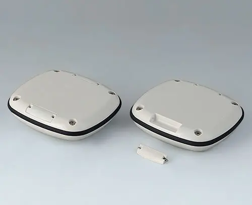 Modern small enclosure specifically designed for "wearable technologies". Three-part design consisting of highly polished top and bottom parts and a matt TPV sealing ring.