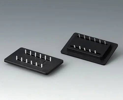 Universal accessory consisting of mounting plates and 6-pin contacts. Simplifies the assembly of contacts for transferring data and charging current between enclosures and stations. The "female" and "male" contacts are already permanently glued in the corresponding mounting plate. The contact pins are freely accessible for soldering work.