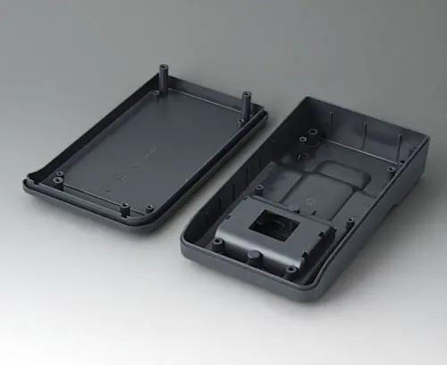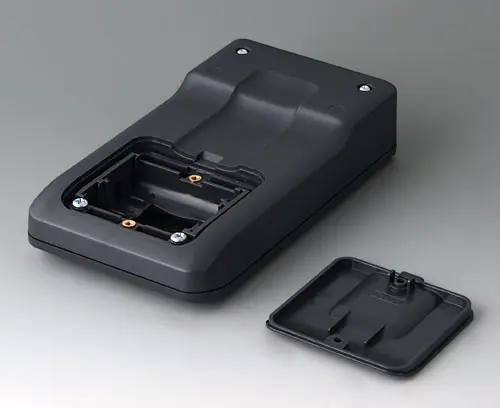 3-part compact hand-held enclosure with an ergonomic, robust design. Ideal for miniaturised electronics applications. Secure grip through finger recess in the bottom part and centre of gravity near the body. With a battery compartment, accessible from the outside, for 3 x 1.5 V AA batteries. Recessed user area to protect the operating elements. Attachment domes for PCBs and components in the top and bottom parts.
