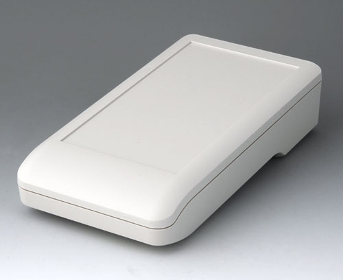 2-part compact hand-held enclosure with an ergonomic, robust design. Secure grip through finger recess in the bottom part. Recessed user area to protect the operating elements. Attachment domes for PCBs and components in the top and bottom parts.