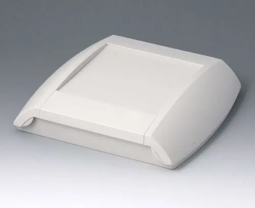 Four-part case. The bottom part can be fixed directly to the wall, the top part will be assembled by means of screws from the front. 2 side trims close the case. If required, the trims can also be locked, thus preventing unauthorised access. Recessed operating area to protect the membrane keyboard. Fastening pillars for PCBs in bottom and top part. Integrated supports for 2 x AA / 1 x 9 V.