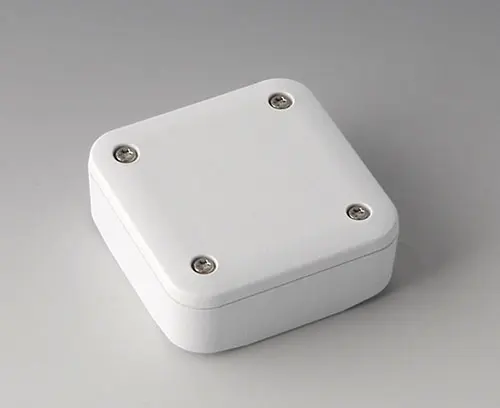 2-part plastic enclosure with high top part, for universal use. Robust design with proven tongue and groove connection. Assembled with Torx stainless steel screws. Fixing supports for PCBs and components in the top and bottom parts. Fastening on the supports is by means of hot caulking.
