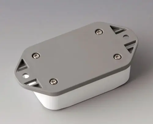 2-part plastic enclosure with high top part. Bottom part with integrated flanges for fast wall mounting or for mounting on rails and tube profiles or on masts. Robust design with proven tongue and groove connection. Assembled with Torx stainless steel screws. Fixing supports for PCBs and components in the top and bottom parts. Fastening on the supports is by means of hot caulking.