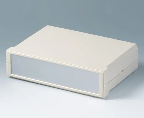MOTEC-L, flat/flat Desk top case with flat base and top part. Screwless mounting of the shells. Front and rear part open. Screw towers for PCBs and vertical guides for mounting panels. Front and rear panels to slide in as accessory.