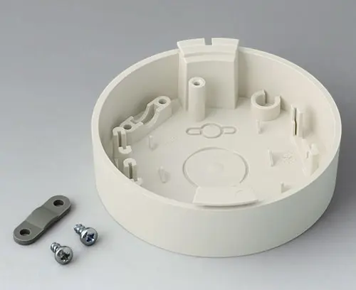 Bottom and top part R110 H Assembly unit: With bayonet lock, snapping into place. If required securing using 2 screws. Screw pillars for PCBs in bottom and top part. Screw pillars for battery compartment (acc.) in bottom part. End piece (lid / battery compartment lid / base / base 30° or base 55°) required for bottom part - see separate article.
