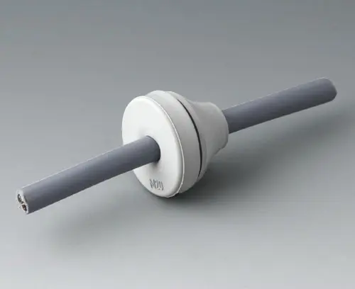 Simple cable grommet, easy to install, with easy-to-pierce membrane. Tight fit as soon as the cable is pulled backwards a little. Free of halogens. Suitable for wall thicknesses from 1 - 4 mm and for cable diameters from 8 - 13 mm. Operating temperatures from -40°C to +100°C. Borehole ø 20.5 mm.