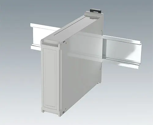 DIN rail enclosure with pluggable side panels and front panel. Connection options on three sides. For plug headers max. 2 x 16-pin, 5.08, fixed or pluggable. Simple and quick assembly by locking onto DIN rails EN 60715 TH35. The panel version provides simple and flexible installation of the electronics as well as efficient, screwless case assembly.
