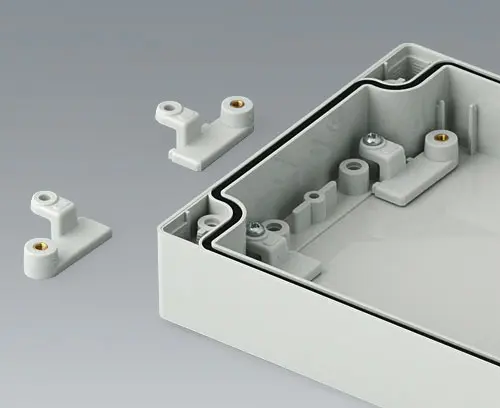ROBUST-BOX WIDTH 240, Vers. I Robust plastic enclosure, ideal for electrical and electronic applications. Case shells either usable as top or base part. Each case part contains threads and fixing towers. Screw fixing outside of the sealing area. Recess of approx. 0.8 mm for use of membrane keyboards.