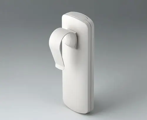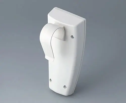 SMART-CASE M, Vers. VI Ergonomic handheld case composed of two parts. Location at the front along with a screw in the center of the case. Possiblities for fixing PCBs in top and base part.