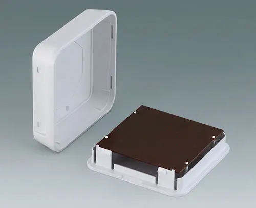SMART-PANEL S84 Elegant two-part plastic enclosure with flat top part. Fastening pillars for PCBs and components in the top part. Bottom part with a series of pre-moulded cut-outs for assembly on standard flush-mounted/cavity wall boxes (machining required). Secure snap-in assembly of top and bottom parts. Rational assembly of the electronics. To open the enclosures easily and practically, we recommend that you use the opening tool set, which is available as an accessory. Recessed operating area protects a membrane keyboard or glass control panel. Resin hardboard protection plate, glass panel, adhesive foil and opening tool available as accessories. Due to the high-quality material (UL 94 V-0) and the elegant design, perfect for use in modern building services technology.