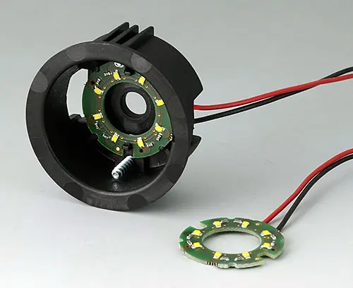 PCB D = 27 mm with 8 LEDs (white light), SMD-technology, connecting cable 120 mm long, 2-pin connector at the end, incl. PCB connector. Universally applicable for knob sizes 33 and 41 mm.