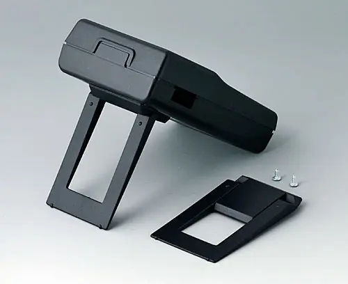 HAND-HELD-BOX P, Vers. I Successfully used case for measuring instruments. With recessed area for imprintings or your logo. Cut-out section for LCD or analogical modules. With battery compartment, accessible from the outside, for 9 V flat battery (PP3) or 1.5 V baby cell (C) with contacts for soldering. Raised front area to accommodate plugs.