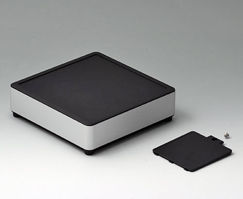 4-part enclosure for many different applications. Sturdy frame made of aluminium, glass bead-blasted and anodised. Plastic parts made of ASA+PC-FR with good UV resistance and high flame resistance. Attachment domes for PCBs and components in the top and bottom parts. Top part with recessed surface to protect the membrane keyboard. Bottom part with opening and screw-down cover: practical for the use of a battery compartment or for access to the interior, e.g. for a memory card or batteries that are mounted directly on the PCB. Battery compartment kit 4 x AA with contact springs, battery clips, button cell holder and wall mounting option as accessories.